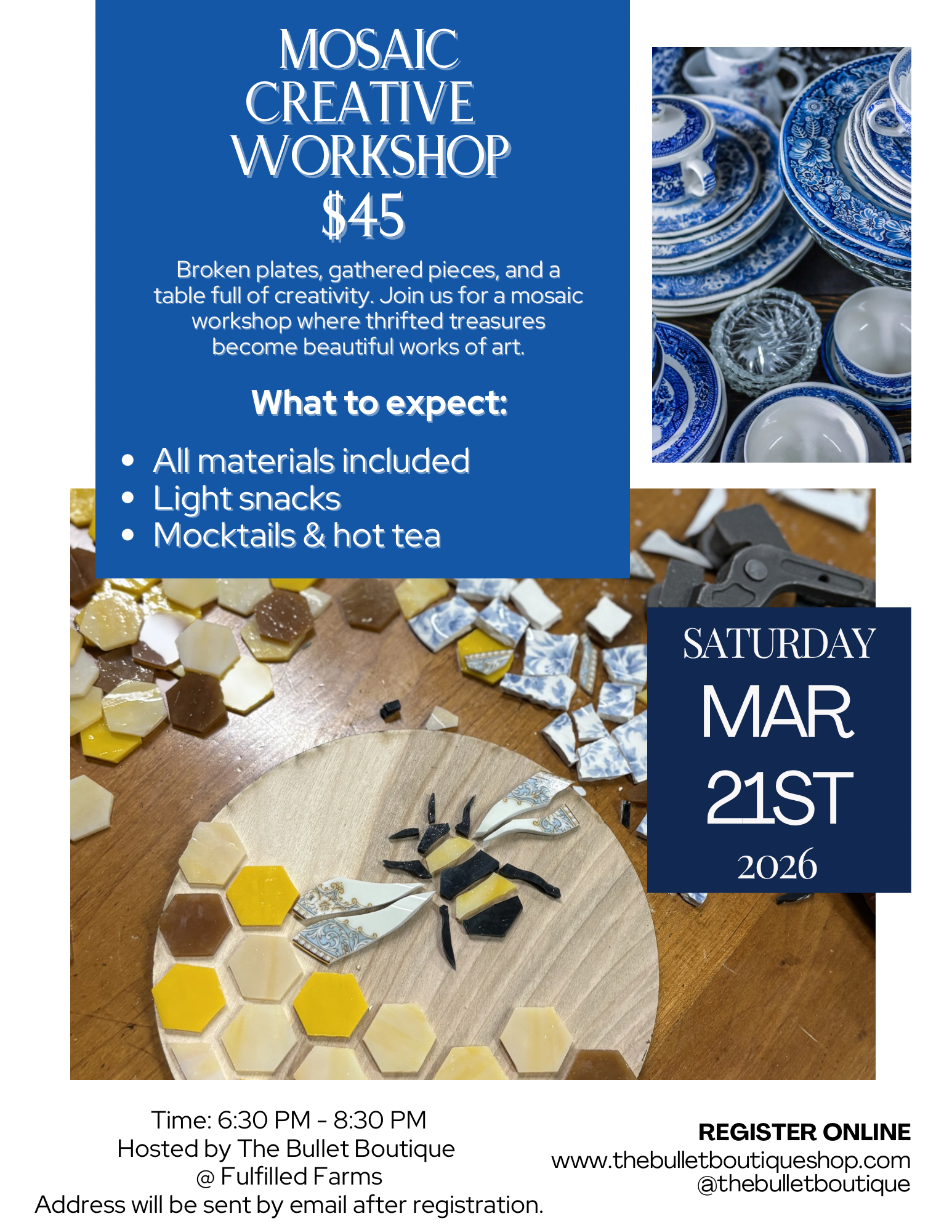 Broken plates, gathered pieces, and a table full of creativity. Join us for a mosaic workshop where thrifted treasures become beautiful works of art.